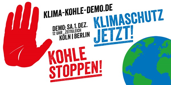 1.12. Großdemo in Köln 17. November 2018 Klima schützen – Kohle stoppen! Wir bieten eine gemeinsame Anfahrt zur Kölner Demo an, mit dem Regionalexpress um 11:02 ab Bonner Hbf.
