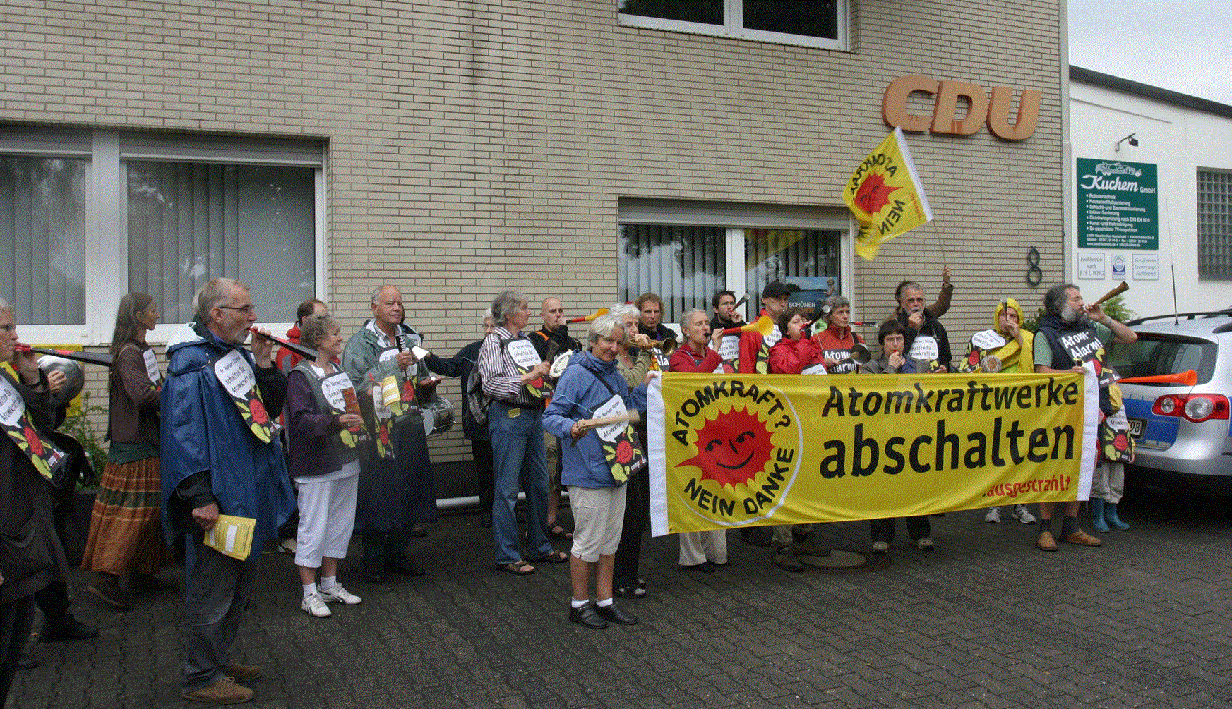 Skeptische Blicke ernteten die Anti-Atom-AktivistInnen in einem einsamen Siegburger Außenbezirk vor dem CDU-Büro Röttgens von einigen Arbeitern und passierenden Autofahrern. Der Regen war ein treuer Begleiter, wenn er auch nicht mehr so leidenschaftlich schüttete. Unerschüttert motiviert war jedoch die immer größer werdende Schar von Atom-Alarmisten, die sich bis zum Alarm auf über 30 TeilnehmerInnen vergrößerte. Auch hier wurde die Umgebung ins Anti-Atom-Gelb gehüllt und die Atomalarm-Leibchen gegürtet. Die bei der Aktion anwesende Polizei war kommunikativ, der Vertreter des Odnungsamts relaxt und ein nachbarlicher Unternehmer genervt, denn auch die dreißig AktivistInnen machten einen “Heidenlärm”. Im Unterscheid zur FDP zeigte die CDU Geschprächsbereitschaft in Gestalt der Büroleiterin, die sich artig alle Argumente der AtomkraftgegenerInnen anhörte und auch die Petition samt der 100-Gute-Gründe-Fibel entgegennahm. Einige TeilnehmerInnen ergriffen den Lautsprecher, um den Fokus auf bisher noch vernachlässigte Gefahren der Atomkraft zu lenken und erweiterten die gelungene Demonstration zur bunten Lernstunde in Sachen Todestechnologien.