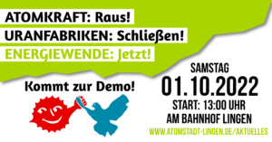 Infos zur Demo: https://atomstadt-lingen.de/2022/09/17/1-10-2022-demo-in-lingen/