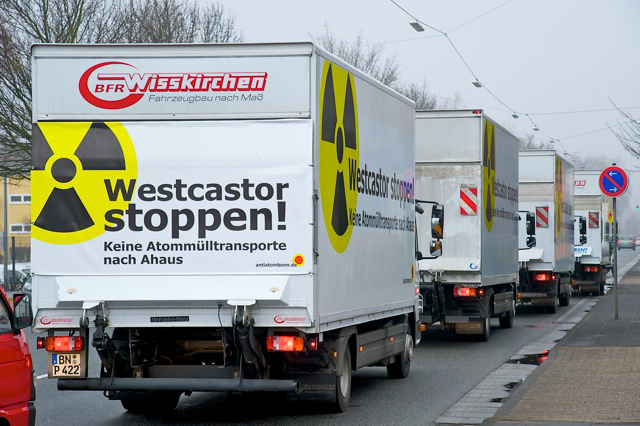 Eine spannende Fahrt war es heute! Immerhin vier Castoren mussten von Bonn über Duisburg nach Jülich gebracht werden – quer durch NRW! Dank bunter Unterstützung von insgesamt 70 Begleitwagen aus Ahaus, Münster, Düsseldorf, Köln, Bonn und vielen anderen Städten konnte der ungefährliche rheinische Atommülltransport sicher nach Jülich gebracht werden.