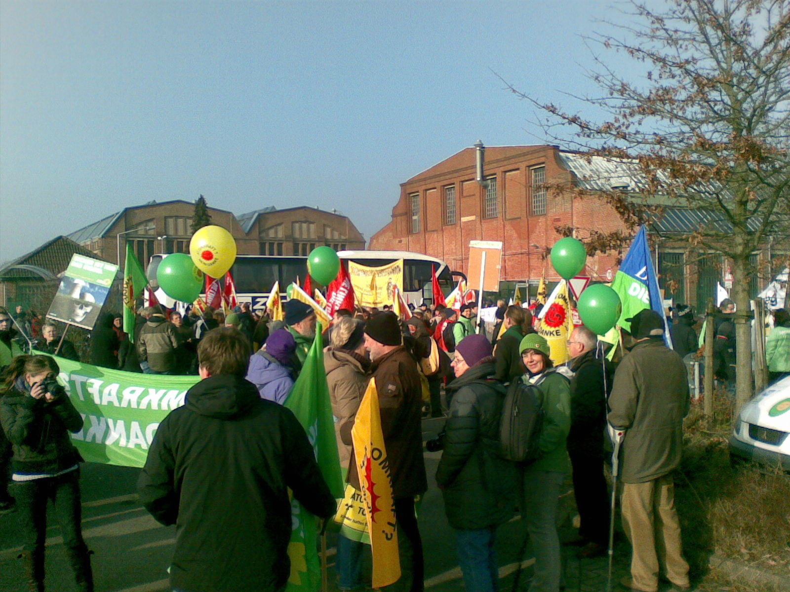 30.01.2011 – Der Demonstrationszug zog vom Bahnhaltepunkte zum Haupttor des Forschungszentrum, bei sonnigen, aber winterlichen Temperaturen, war die Stimmung sehr entspannt.