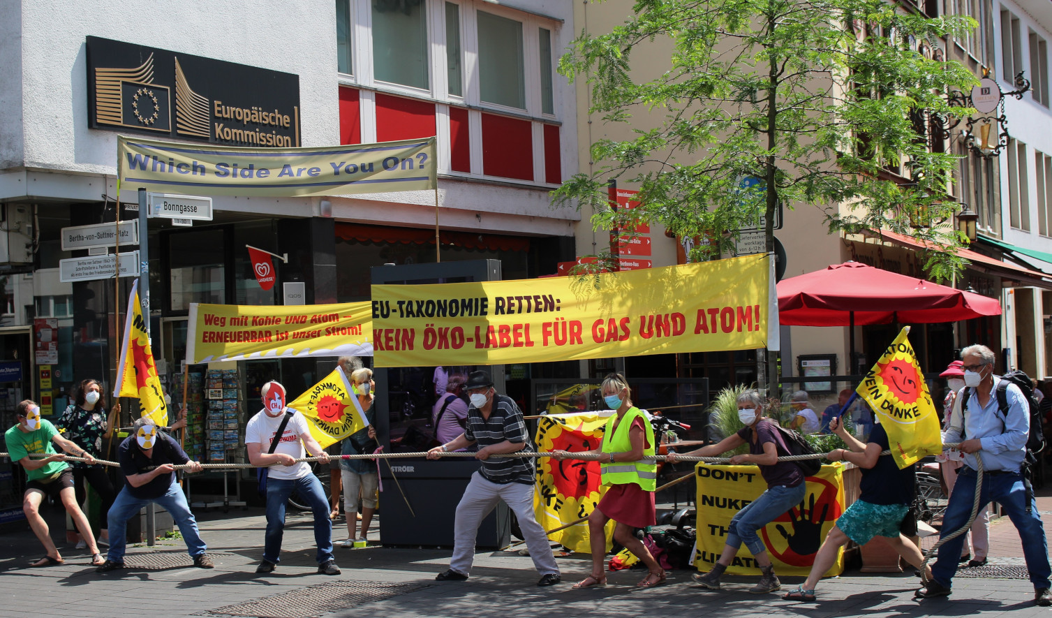 Am 18. Juni riefen Klima- und Anti-Atom-Initiativen dazu auf, während des EU-Finanz- und Wirtschaftsminister*innen-Treffens, vor den Vertretungen der EU-Kommission in Berlin, München und Bonn gegen das Greenwashing von Atomenergie zu protestieren. Ziel war es, öffentlich Druck zu machen, um das Greenwashing von Atomkraft und fossilem Gas durch die Gas- und Atomlobbyist*innen zu verhindern. Auch AntiAtomBonn hatte aufgerufen, sich am Aktionstag zu beteiligen.