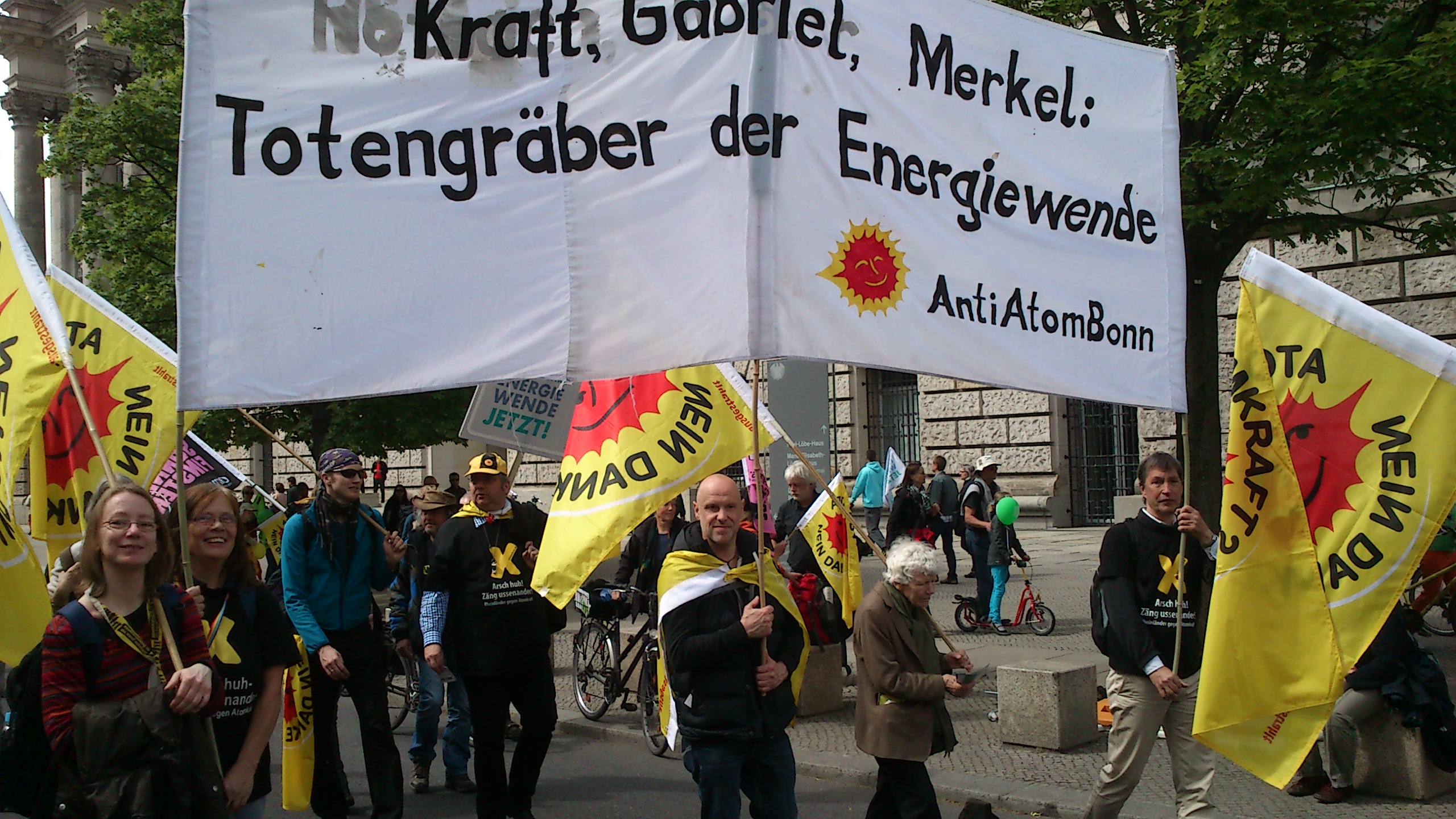Fantasievoll, bunt und gut gelaunt – so lässt sich die Energiewende-Demo am Samstag in Berlin beschreiben, an der über 12 000 Menschen teilnahmen. Auch AntiAtomBonn war dabei (wie das Beweisfoto zeigt). Am Spreeufer jubelten wir zuerst der beeindruckenden Parade von Booten zu, reihten uns dann – ausgerüstet mit unserem Transparent – in den Demozug ein. Das Parlementsgebäude und das Brandenburger Tor hinter uns lassend gelangten wir schließlich zum Konrad-Adenauer-Haus, wo die Abschlusskundgebung stattfand. zwei hochkarätige Bands sorgten für gute Stimmung, während die Redner – vor allem Christoph Bautz und Jochen Stay – durch ihren ihren Kampfgeist und ihre pointierten Analysen begeisterten.