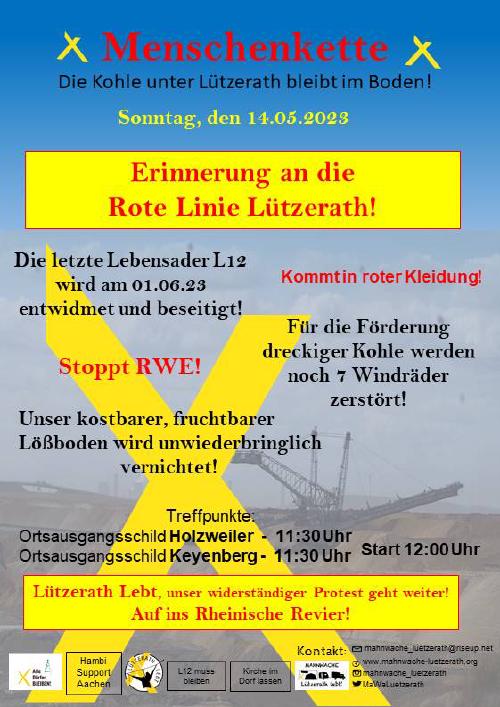 Die L 12 ist die letzte Verbindungsstraße zwischen Holzweiler und Keyenberg. Sie soll am 01.06.23 entwidmet und beseitigt werden! Gegen jegliche wissenschaftliche Vernunft treiben RWE und die Landesregierung die Zerstörung unserer aller Lebensgrundlage voran. RWE darf keine weiteren Fakten schaffen!