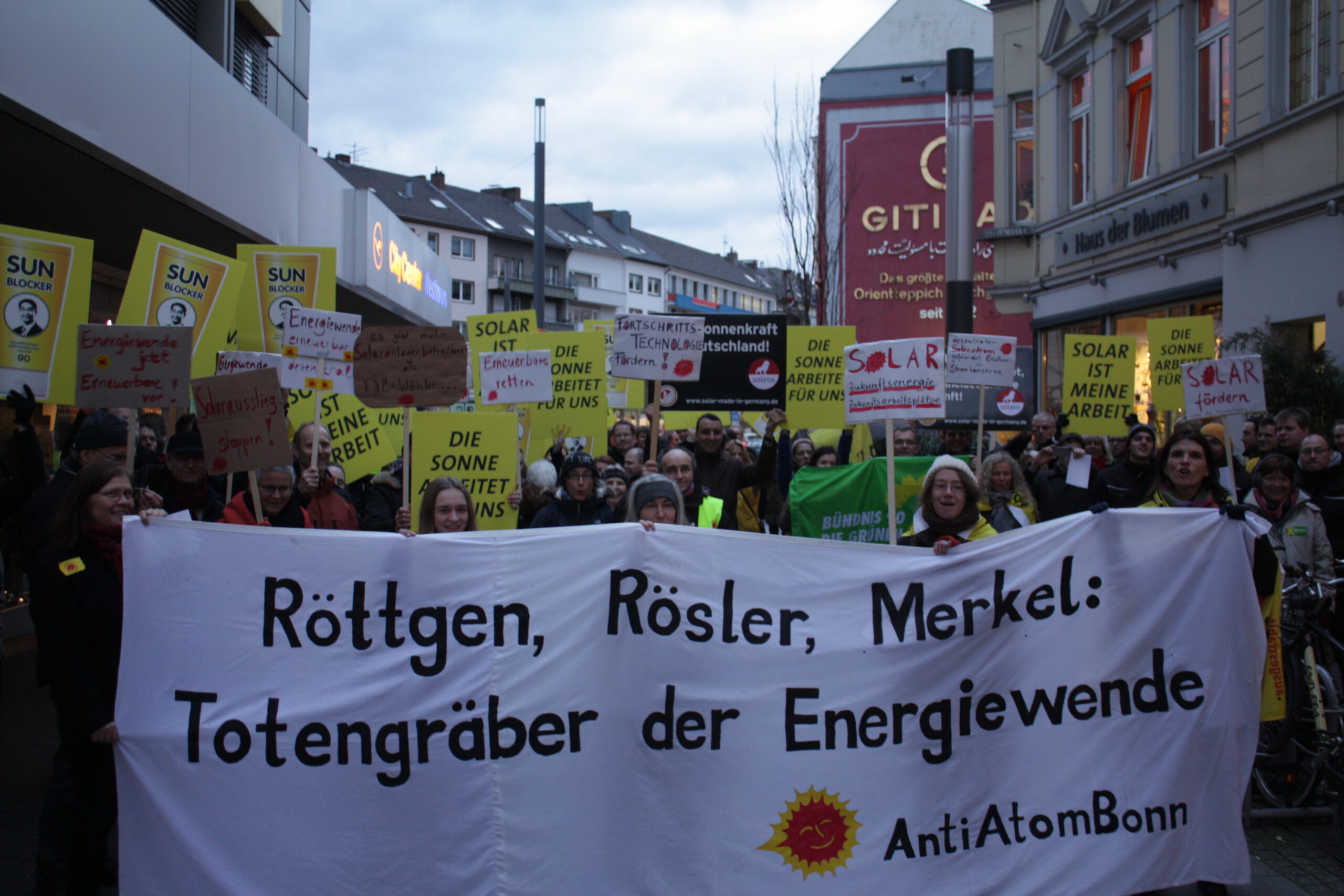 Über 130 BonnerInnen demonstrierten am 5.3. in Bonn für die Energiewende und gegen den von Röttgen und Rösler geplanten Kahlschlag des EEG. Nicht nur AtomkraftgegnerInnen, sondern auch zahlreiche BürgerInnen und ArbeitnehmerInnen der Solarbranche nahmen an der Demonstration teil. Der bunte und lautstarke Zug ging quer durch Bonn und endete vor dem Bonner Hauptbahnhof mit einer Kundgebung, Musik (Selassikai) und Verpflegung (Volxküche und Infostand).
